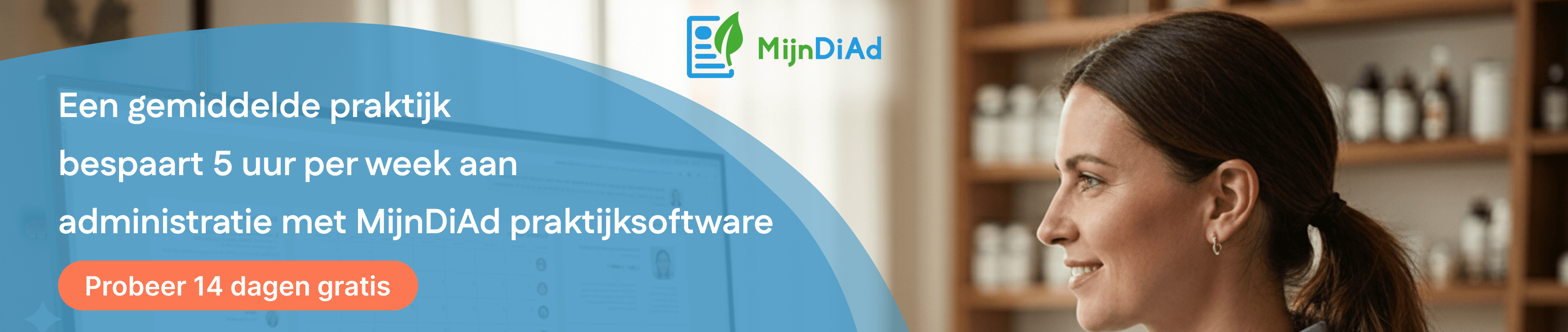 MijnDiAd is ontworpen om jouw werkdag makkelijker te maken. Probeer het nu 14 dagen gratis en ontdek hoe eenvoudig praktijkadministratie kan zijn. Ga naar www.mijndiad.nl om geheel vrijblijvend je probeer-omgeving aan te maken.